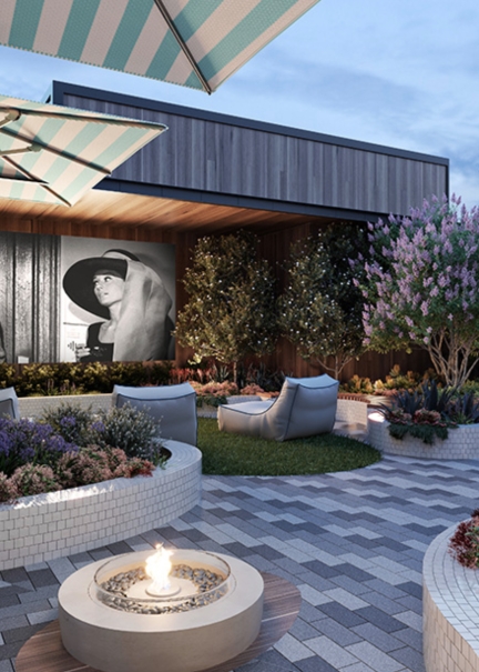 郁郁葱葱的屋顶花园设有电影院、烧烤区、瑜伽区和观景台。随着太阳落山,没有什么比在星空下看电影更完美的了。