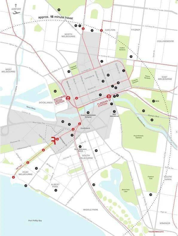 公交:公交站台仅20米,2站可到墨尔本交通枢纽southern cross火车站,5站可达市中心商圈和女皇市场,往南5分钟到Port Melbourne海滩